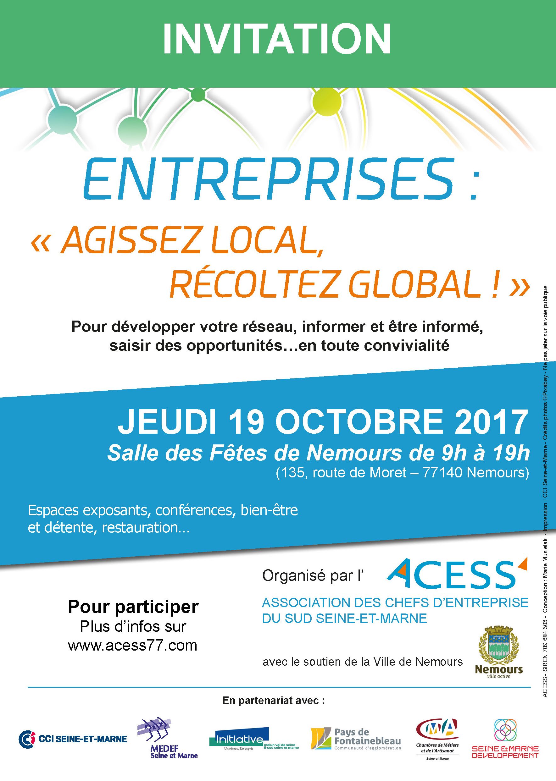Jeudi 19 octobre 2017, l'Acess organise son premier salon d'entreprises du sud Seine-et-Marne, à la salle des fêtes de Nemours : espaces exposants, conférences...