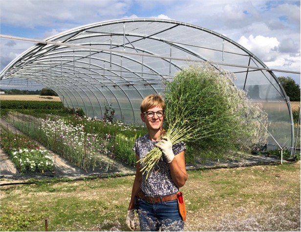 Isabelle Chanclud a travaillé pendant 30 ans comme salariée de la Chambre d'agriculture de Seine-et-Marne. En 2019, elle s'installe comme agricultrice et diversifie son exploitation avec une activité de fleurs coupées bio sur 5000m². La transition écologique est au coeur de son projet: Les fleurs sont cultivées sur des paillages en fibres tissées qui réchauffent le sol au printemps, limitent le développement des herbes indésirables et réduisent l'évaporation de l'eau du sol. Une haie biodiversité a été plantée et l'irrigation s'effectue par un système d'arrosage goutte-à-goutte qui réduit la consommation d'eau.