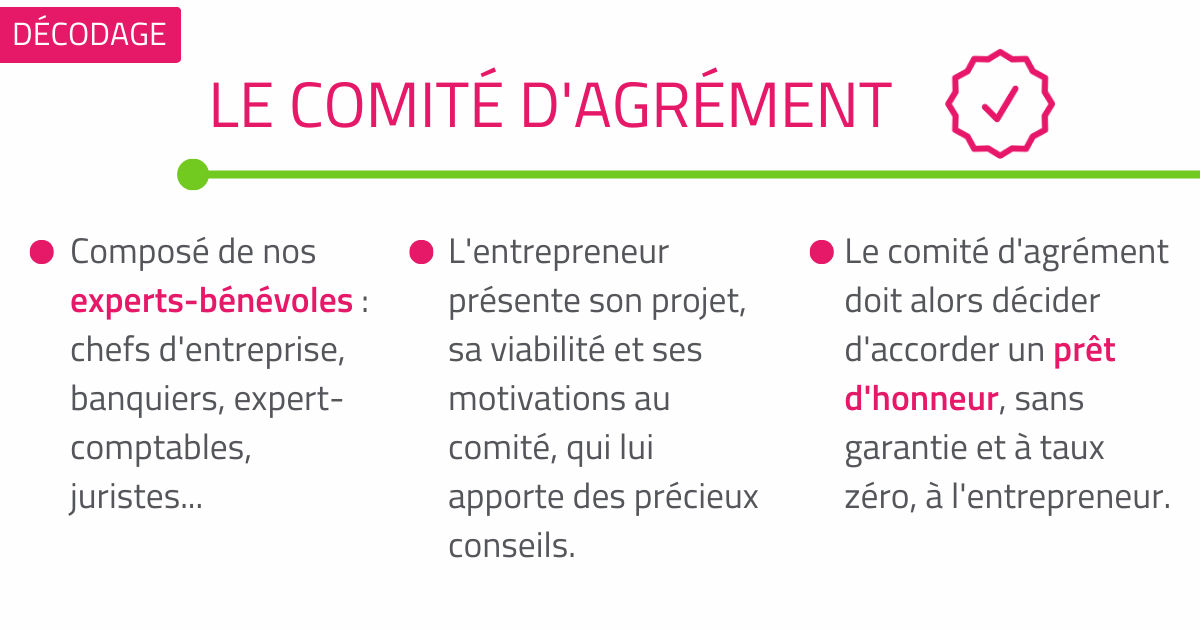 Le comité d'agrément à pour vocation de challenger le projet du/des porteur(s) afin de voir si ce projet est viable et si les objectifs envisagés sont réalistes et atteignables.
