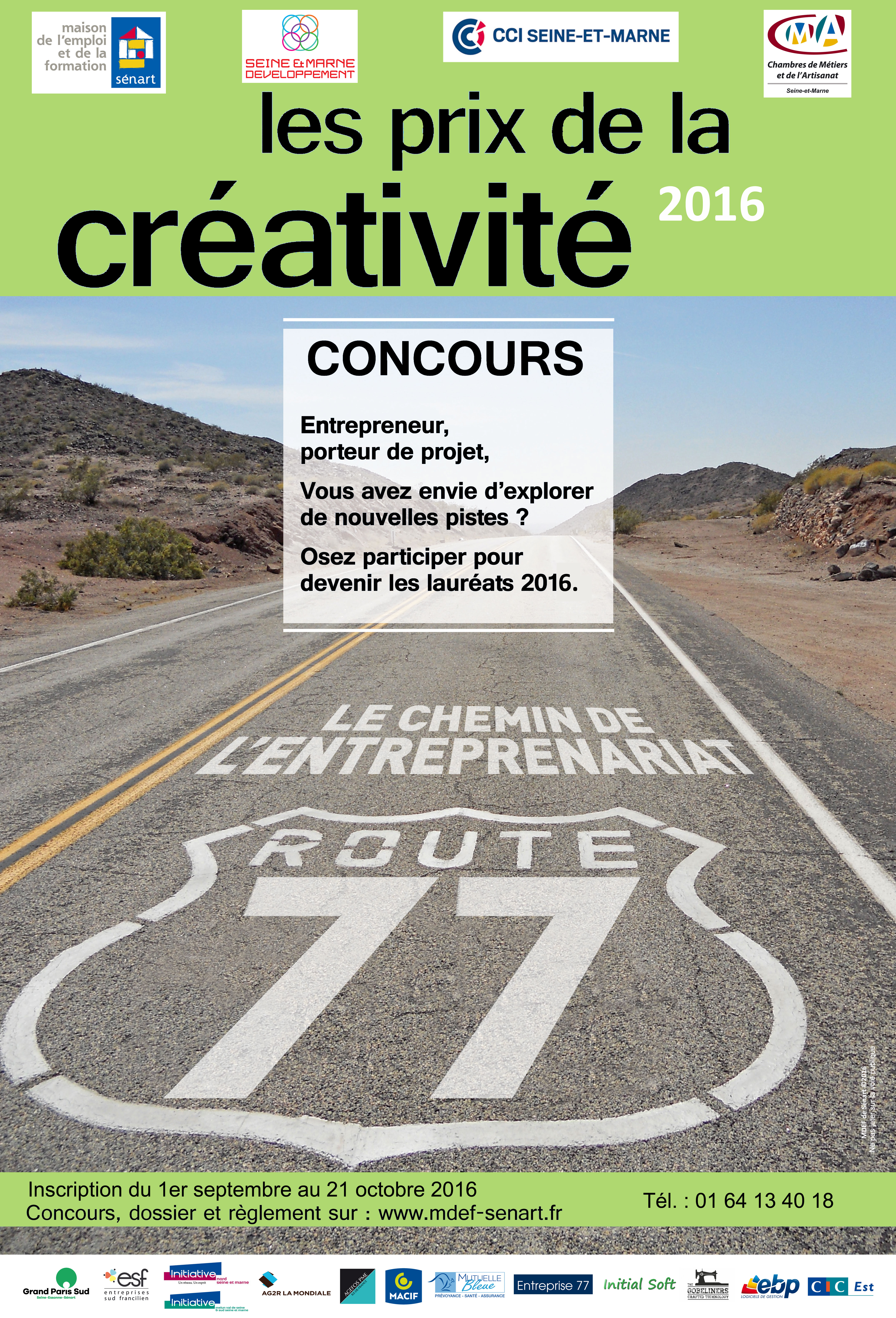 Participez aux concours « Prix de la créativité 2016", organisé par la Maison de l’Emploi et de la Formation de Sénart avec le soutien de Seine-et-Marne Développement de la Chambre de Commerce et d’Industrie de Seine-et-Marne et la Chambre des métiers et de l’artisanat de Seine-et-Marne.